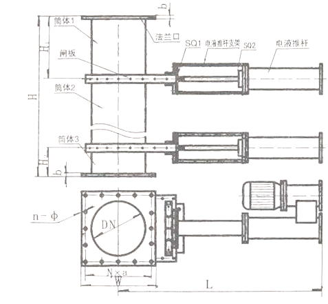 本閥為機、電、液、控于一體的卸料裝置,接通電源后,上閥電液推桿自動打開閘板,至限位開關(SQ2)后,停留數秒卸料,然后關閉上閥閘板,至限位開關(SQ1)后轉入下閥工作,下閥電液推桿打開閘板至限位開關(SQ4)后,停留數秒卸料,然后關閉下閥閘板至限位開關(SQ3)后轉入上閥工作。如此交替工作,至設定的卸灰量后,自動停止全過程工作。
