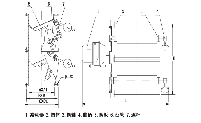 由減速器帶動傳動桿通過曲柄、凸輪及連桿分別帶動上、下兩傳動軸旋轉,交互開啟,通過配備的杠桿系統或拉伸彈簧,保證閥板可靠的復位,防止野風吹入,依確定的開閉頻率完成系統的給卸料。